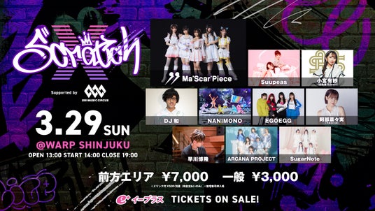 3月29日(日)にMa’Scar’Pieceが主催する対バンイベント「Scratch X Supported by SBI MUSIC CIRCUS」の開催を控え、勢いが増すなか、新たなアーティスト写真も公開。アイドルの枠を超えフロアを揺らすDJとして、Ma’Scar’Pieceが提唱する、新たな“アイドル×クラブカルチャー”を象徴するビジュアルとなっています。
