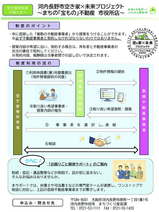 河内長野市では、多くの空き家所有者が抱える「どこに相談すればいい?」や「手続きが分からない」などの声にこたえ、不動産事業者への窓口となることで、今後、急増する空き家を積極的に市場へ流通する仕組みを構築し、空き家問題の解消や転入促進を進めます!