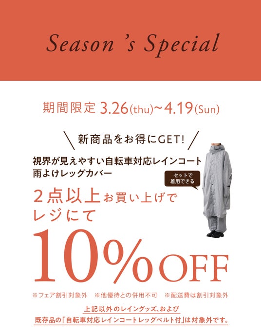 ※上記以外のレイングッズ、および既存品の「自転車対応レインコートレッグベルト付」は対象外