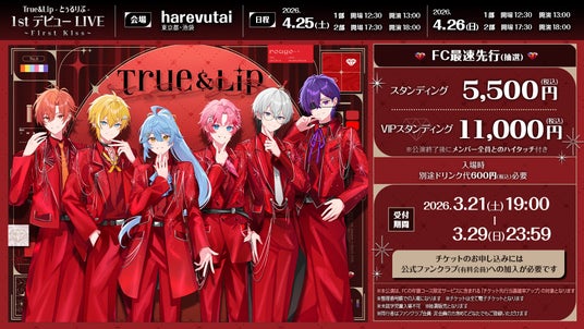 さらに、初のワンマンライブ『True&Lip - とぅるりぷ - 1st デビュー LIVE ~First Kiss~』を、2026年4月25日(土)・26日(日)にharevutaiにて開催いたします。チケットは現在、2026年3月29日(日)23:59までFC最速先行を受付中です。「とぅるりぷ」の記念すべき第一歩を、ぜひ会場でご体感ください。