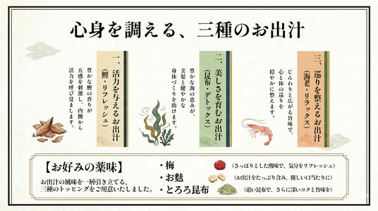 春は「かつお」「昆布」「海老」の3種のお出汁に、トッピングとして「梅」「麩」「とろろ昆布」をご用意しております。