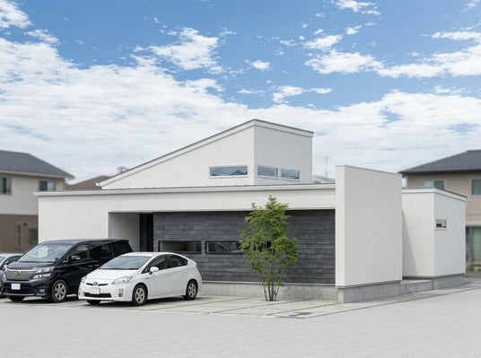 そこにアクセントとして組み合わされた「傾斜屋根」が、シンプルながらもダイナミックな表情を演出します。