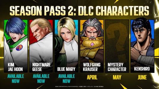 Season Pass 2では、『餓狼伝説』シリーズより「キム・ジェイフン」「ナイトメアギース」「ブルー・マリー」「ヴォルフガング・クラウザー」の4キャラクターに加え、アニメ『北斗の拳 -FIST OF THE NORTH STAR-』より「ケンシロウ」の参戦が決定。さらに後日発表予定のミステリーキャラクター1体を含む、全6キャラクターを毎月順次配信予定です。