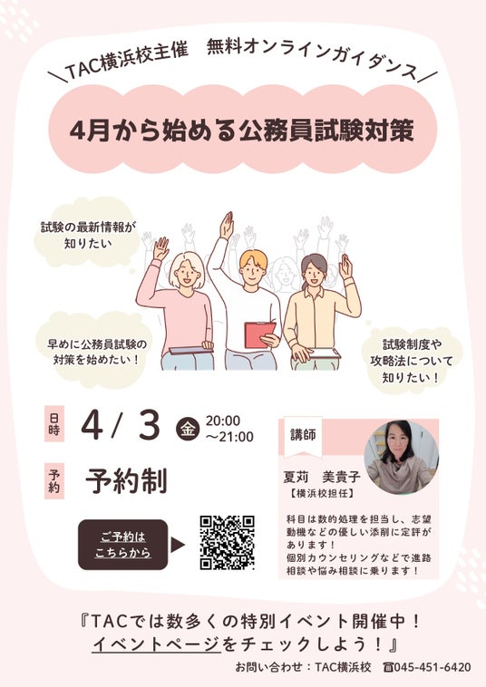 資格取得に向けた教育サービスを展開しているTAC株式会社(東京都千代田区)では、公務員試験を検討されている方へ向けて「4月から始める公務員試験対策」を、オンラインで開催します。