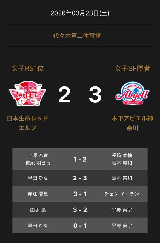ノジマTリーグ2025-2026シーズン プレーオフ 女子ファイナル 3月28日(土) 開催 日本生命レッドエルフ vs 木下アビエル神奈川 の試合は、3-2で木下アビエル神奈川が勝利しました。
