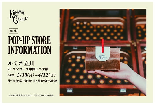 東京・蔵前にあるSNSで話題の焼き立てカヌレ専門店「KURAMAE CANNELE(クラマエカヌレ)」(運営:CLASSIC INC.、代表取締役 : 萱場俊克、本社 : 東京都渋谷区)は、2026年3月30日(月)~4月12日(日)の期間限定で、ルミネ立川にて催事に出店いたします。