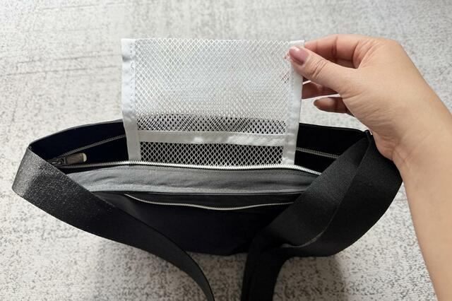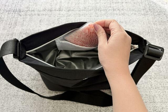 ちなみに内側には保冷剤を入れるのにちょうどいいサイズ感の小さなメッシュポケットがついているのですが、保冷剤を入れないときは鍵やリップなどの小物入れとしても活躍します。