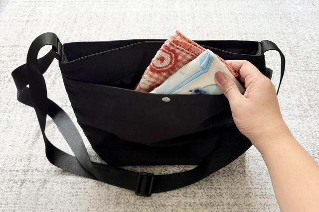 前面はスナップボタン付きで、ポケットティッシュやエコバッグなど、すぐ取り出したいものを入れておくのに便利。