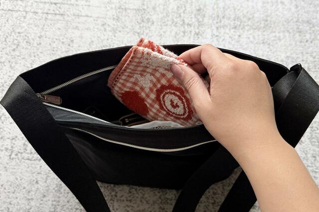 たとえばペットボトルや保冷剤の結露、使用後の濡れたハンカチや冷感タオルなども、気兼ねなく入れられます。