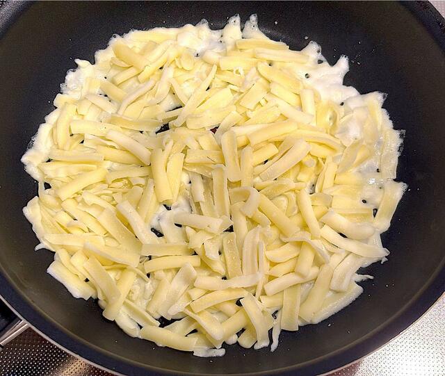 3. フライパンにチーズを平たく広げて、火にかける。