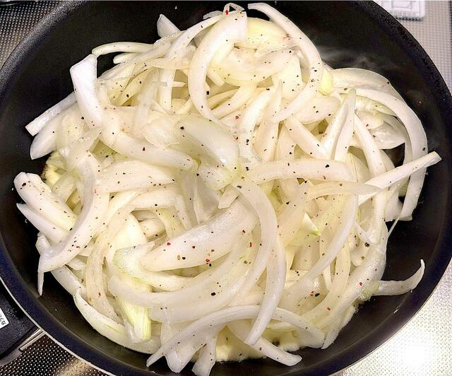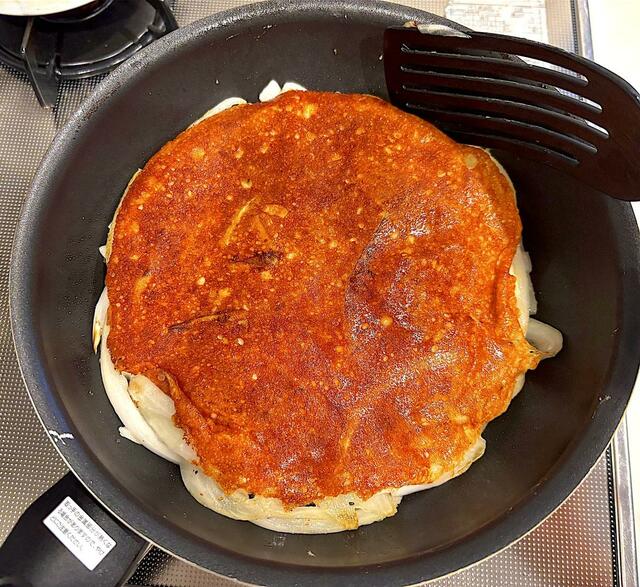 4. チーズが溶けてきたら玉ねぎを上にのせ、一度ヘラで玉ねぎを押し付けるようにおさえたら、そのまま3分ほど焼く。