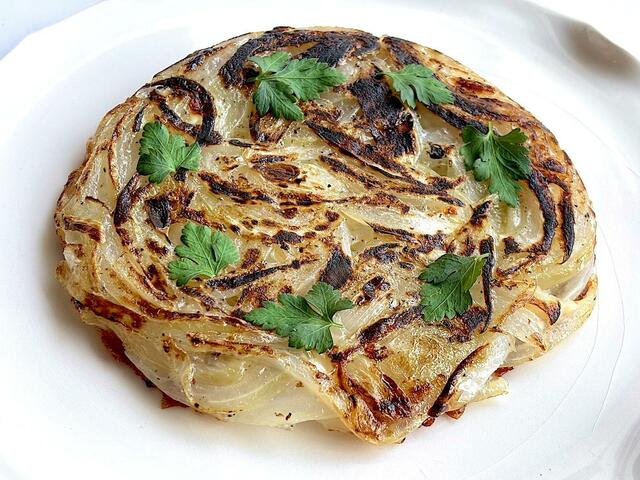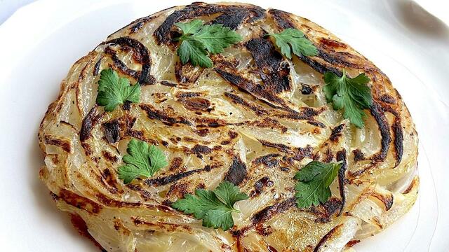 5. 玉ねぎがしんなりしたらヘラでひっくり返し、裏面も3分ほど焼く。このとき、フライパンの鍋肌にオリーブオイルをひと回しする。玉ねぎが透き通ってお好み焼きのように円盤状に焼けたらできあがり。