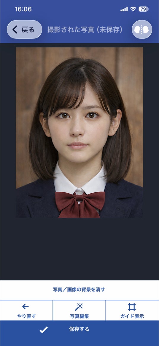 そしてこの度のアプリバージョンアップで、スマホアプリ版(iPhone/Android)に背景除去機能搭載。写真撮影の際、背景となる撮影場所選びの煩わしさがなくなりました。併せて、背景色の自由設定が可能になりました。背景除去後の背景色として、提出先など使用目的に適した色や、顔色が映える色を、ご自由に設定いただけます。◎背景除去機能