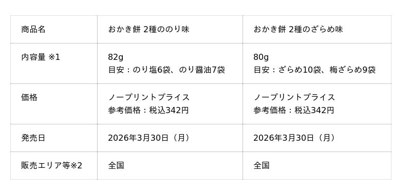 三幸製菓株式会社(所在地:新潟市北区)は、食感と風味にこだわったかき餅2種アソート「82g おかき餅 2種ののり味」と「80g おかき餅 2種のざらめ味」の2品を、2026年3月30日(月)から全国で発売いたします。
