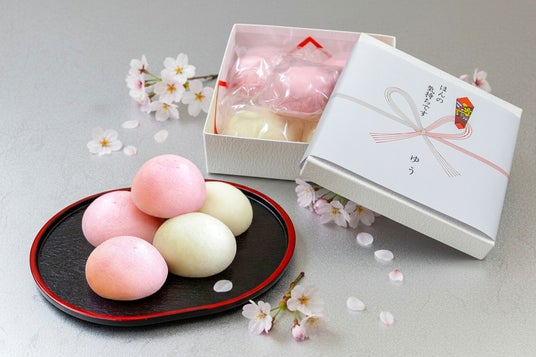 皮はふっくら福々・もっちもち!慶びに満ちた人生の節目にふさわしく、これからの人生にたくさんの福が舞い込むようにという、祈りを込めた祝菓です。