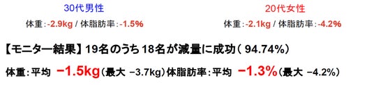 実際に先行して実施したモニターによる検証でも、顕著な「体型維持と改善」の結果が出ております。実施期間(2週間にて自社計測)