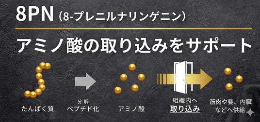 1. 「8PN」配合により、トレーニングの効率化と休息日の維持をサポート配合成分「8PN」は、筋タンパク質分解指標(Atrogin-1)の発現を抑制する働きがあるといわれています。骨格筋へのアミノ酸取り込みを高めてトレーニングによる筋合成率を最大30%向上に期待ができる「攻め」のアプローチに加え、運動を併用せずとも筋肉の分解を抑えて萎縮を防ぐ「守り」の機能を兼ね備えることで、ハードなトレーニングに励む方はもちろん、多忙による休息日や怪我による療養期間、さらには加齢に伴う筋力低下が気になる方まで、あらゆるフェーズにおける筋肉のコンディション維持をサポートします。