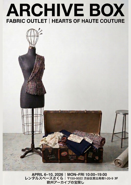 合同会社C.F.S.(所在地:東京都千代田区、代表:上野伸悟)が代表を務める欧州服地卸、株式会社エス・アンドーは、イタリアの環境規格 UNI EN ISO14021を取得し、「生地を捨てない」をコンセプトに掲げるイタリアの高級生地卸「ReLiveTex(R)(リライブテックス)」と日本国内における独占契約を締結いたしました。 これに伴い、2026年4月6日(月)から10日(金)の5日間、東京・恵比寿にて、ハードルの高い欧州素材を開放する展示販売会「ARCHIVE BOX - 欧州素材の宝探し」を開催いたします。