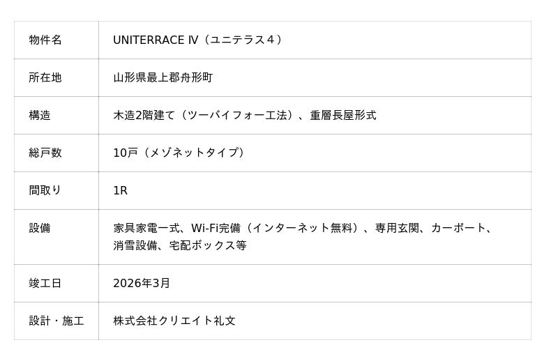 株式会社クリエイト礼文(本社:山形県山形市、代表取締役CEO:大場友和)は、山形県最上郡舟形町において、学生向けアパート「ユニテラス」シリーズの第3棟目(教職員向けを含め累計4棟目)を2026年3月に竣工いたしました 。