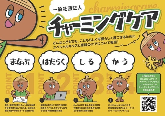 病気や障害のある子どもと家族のための生活の質の向上に着目し、「まなぶ・はたらく・かう・しる・おうえんする」の5軸の事業を展開しています。https://charmingcare.jp/