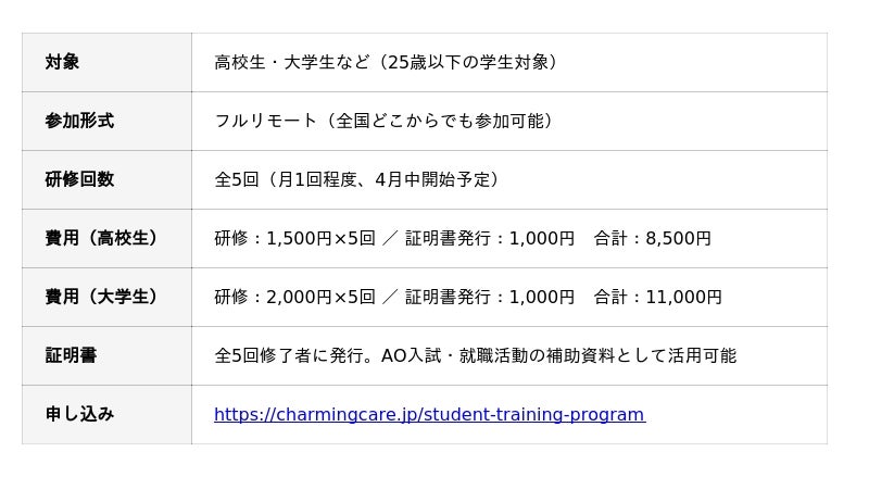 一般社団法人チャーミングケア(大阪府池田市、代表理事:石嶋瑞穂)は、2026年3月30日より、高校生・大学生を対象とした「ボランティア/業務委託育成プログラム」の一般募集を開始します。あわせて、これまで活動してきた保護者アンバサダーについても、同プログラムの受講を参加要件として必須化いたします。