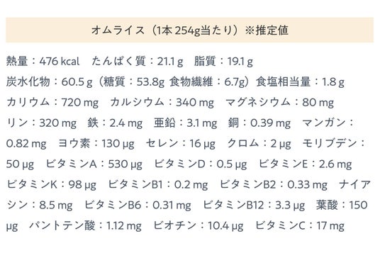 厚生労働省「日本人の食事摂取基準(2025年版/3~5歳)」に基づき、3~5歳の幼児期に不足しがちなたんぱく質・カルシウム・鉄分・食物繊維を、えいようぐるり1食(1/2本)で1日分の基準値の約1/3をカバーする設計としています。 また、そのほかのビタミンやミネラル、DHA・EPAなどを含め、合計30種類以上の栄養素をバランスよく配合。