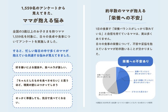 こうした背景のもと、全国の3歳以上の子どもを持つ母親1,559名を対象に、日々の食事や食卓に関するアンケート調査を実施しました。その結果、多くの母親が以下のような共通課題を抱えていることが明らかになりました。