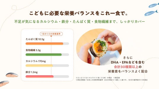 「こどもに必要な栄養をぐるっとひと巻きに」をコンセプトに、30種類以上の栄養素を、こどもたちが大好きなおにぎり(ごはん巻き)に詰め込みました。特徴1:一食で幼児期に必要な30種類以上の栄養素がバランスよく摂れる