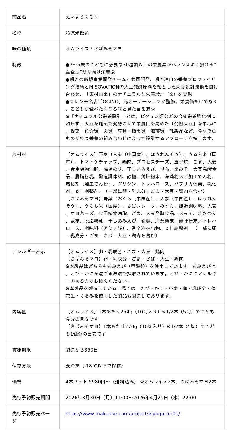株式会社MISOVATION(本社:東京都中央区、代表取締役:斉藤悠斗)は、株式会社明治の新規事業開発チームと共同開発した、3~5歳の“主食型”幼児向け栄養食「えいようぐるり」を発表しました。2026年3月30日(月)11:00より、応援購入サービス「Makuake」にて先行予約販売を開始いたします。
