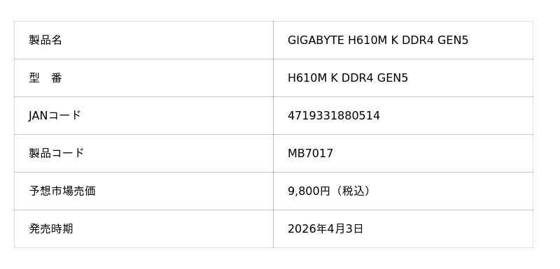 株式会社ニューエックス(本社:東京都千代田区)は、取り扱いメーカーであるGIGABYTEより、Intel H610 チップセットを搭載した上 Micro-ATX マザーボードの「GIGABYTE H610M K DDR4 GEN5」を2026年4月3日(金)に発売いたします。