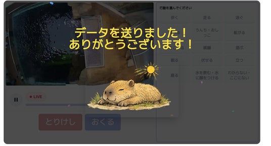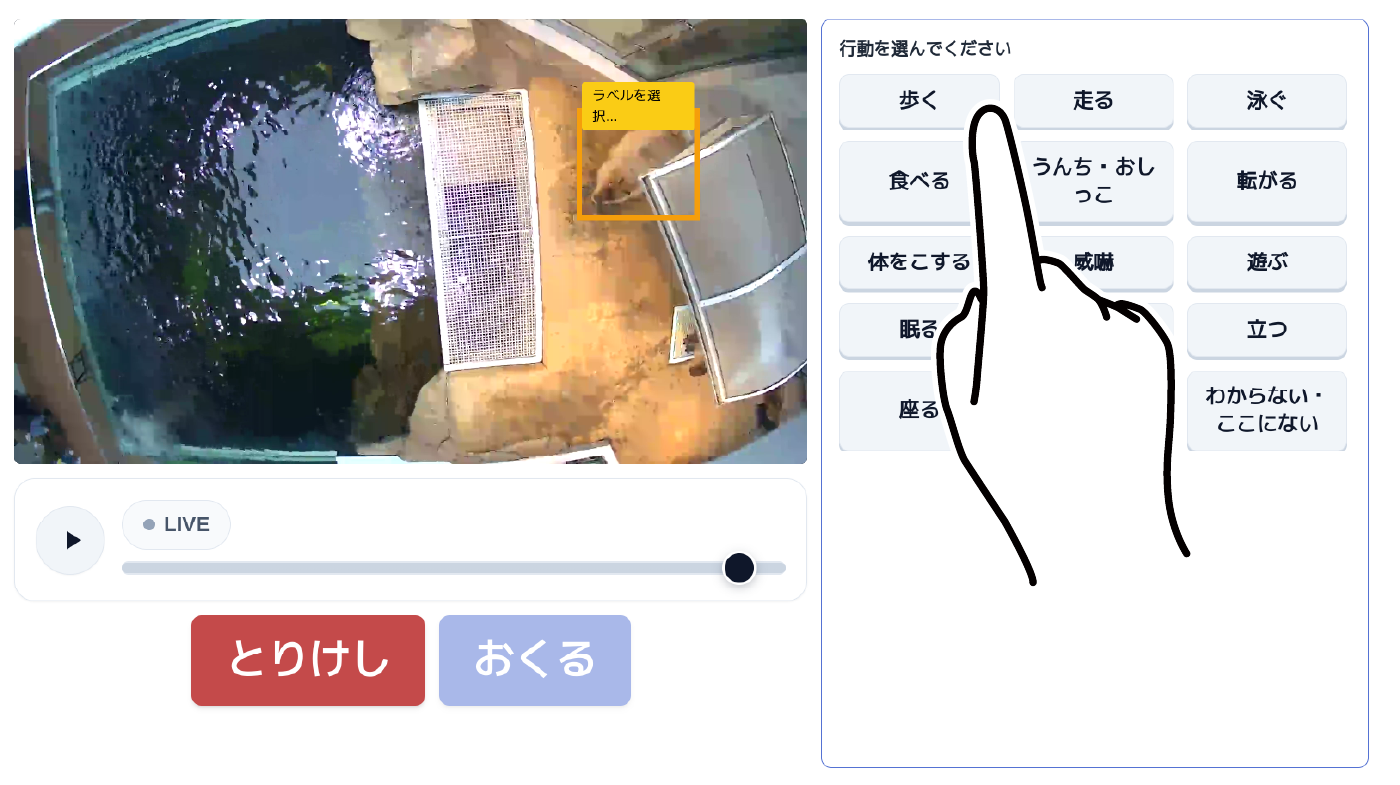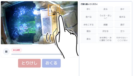 なお、本展示は、生物行動分析におけるデータ収集の新たな可能性を広げることも目的としています。来館者によるアノテーションは行動分析データとして蓄積し、AIモデルのチューニングに活用できるかを検証します。蓄積したデータを活用し、生物行動分析の精度向上を目指します。