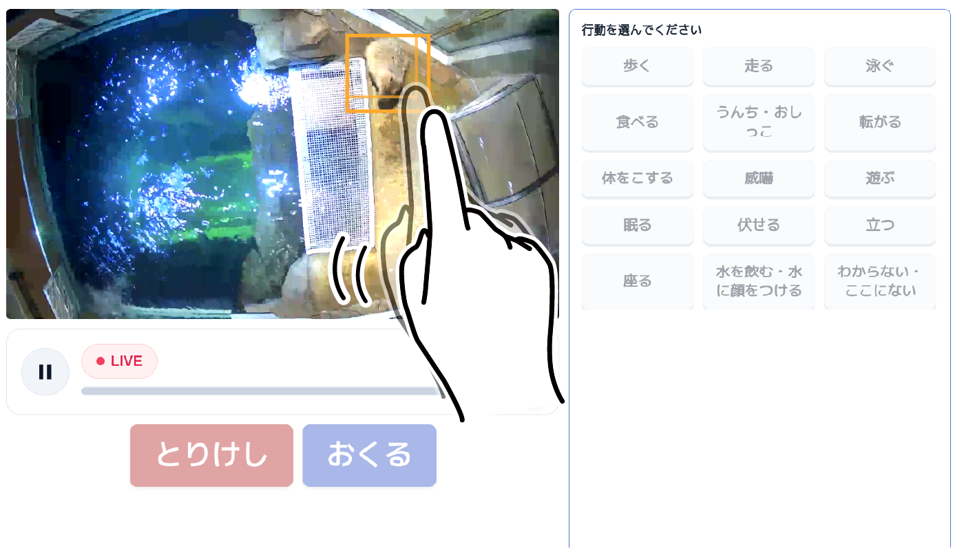 1.タッチパネルに表示される飼育エリアのリアルタイム映像の中からカピバラを見つけ、タッチ&ドラッグで四角く囲みます。