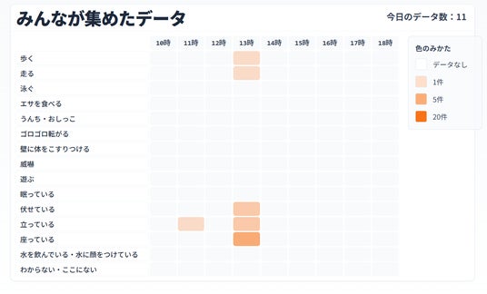 カピバラの行動の種類と時間帯ごとの分布を一覧で確認でき、自身が入力したデータがどのように蓄積されているかを視覚的に確認することができます。
