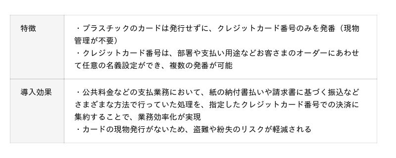本サービスは、法人や地方公共団体などを対象に、プラスチックのカードは発行せずクレジットカード番号のみを発番し、公共料金や経費などの精算をカード決済に集約することによりクレジットカード機能を活用した業務の効率化、コスト削減を図るものです。
