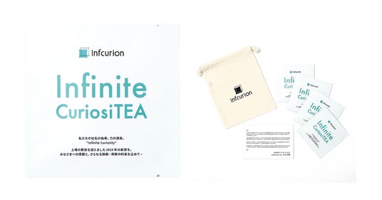 上場年である2025年に摘まれた新茶は、芽吹きの瞬間を閉じ込めた一杯であり、インフキュリオンの新たな節目と同年摘採という象徴的な重なりを持ちます。その清らかな香りと柔らかな味わいが、共に歩んできた時間への感謝と共に歩む未来を思い返させる、上場という新たなステージにおいても、ステークホルダーの皆様と共に『無限の好奇心』を持って未来を切り拓いていきたいという、当社の決意を込めたギフトです。ティーバッグのパッケージには、社名の由来「Infinite Curiosity(無限の好奇心)」にちなんだオリジナルの名称「Infinite CuriosiTEA」をコーポレートカラーの「グリーン」であしらい、従業員が取引先・顧客に持参する際の運用面を考慮して、コーポレートロゴ入りの巾着に、代表からのメッセージを添えてセットした上で一括納品しております。