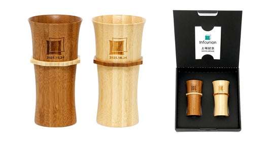 従業員向けのギフトには、挑戦と継承を積み重ねてきた同社の歩みの象徴として、何度も成長を重ねその速度が早いことから、しなやかで持続的な成長を想起させる“竹”を素材に用いたタンブラーを選定し、表面にはコーポレートロゴと上場日を刻印した色違いのタンブラーをペアセットにしました。ペアセットで贈ることにより、ご家族や大切な方と利用し共有する時間を通して従業員の誇りをより一層育みます。さらに、インフキュリオンの丸山代表取締役社長CEOからのメッセージカードを添えて、各従業員へ贈呈いたしました。