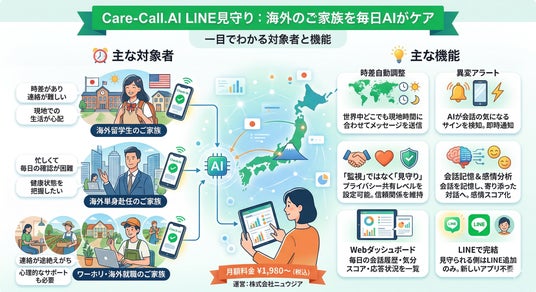 株式会社ニュウジア(東京都中央区、代表取締役 柏口之宏)が運営するAI見守りサービス「Care-Call.AI」は、2026年3月30日より新サービス「Care-Call.AI LINE見守り」の提供を開始しました。海外留学中のお子さんや海外赴任中の配偶者を持つご家族が、LINEを通じてAIと毎日会話し、その内容をご家族がダッシュボードで確認できるサービスです。