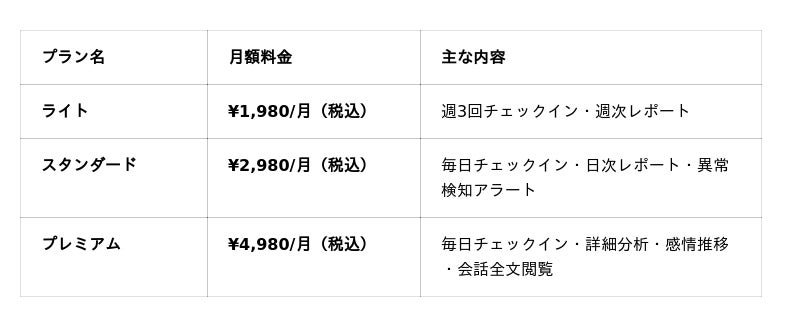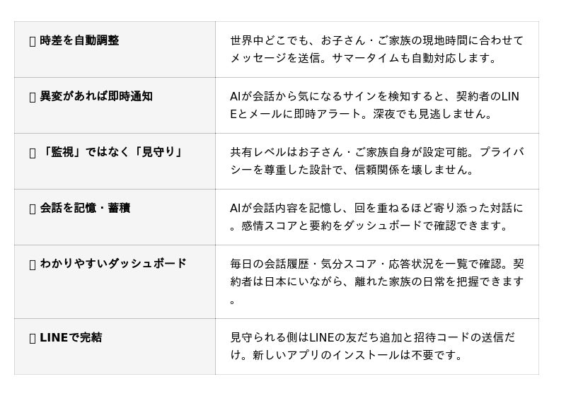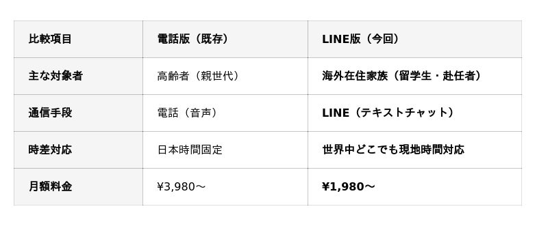既存ユーザーの声から誕生。時差を自動調整し、日常会話から安否確認と感情スコア分析を行う新サービスを月額1,980円から提供開始。専用アプリ不要でLINEで完結。