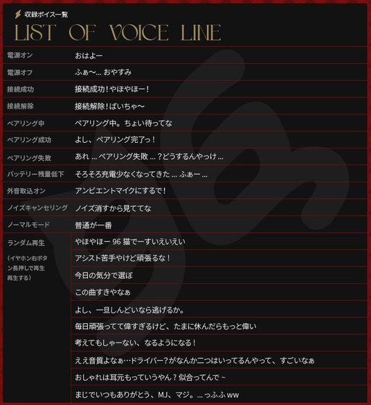 イヤホンの起動・終了、端末との接続状況をお知らせするボイスガイダンスを 96猫仕様で収録。さらに、本コラボモデルでしか聴くことのできないランダムボイスも搭載。