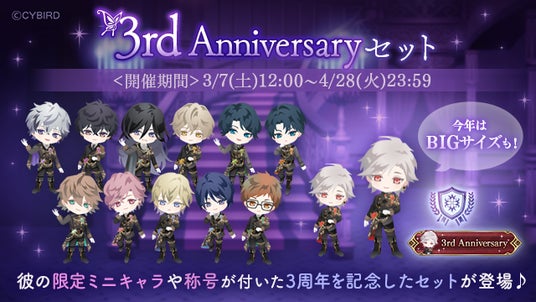 株式会社サイバード(本社:東京都品川区、代表取締役社長 兼 CEO 長嶋 貴之、以下、「サイバード」)が手掛ける、全世界でのシリーズ累計会員数4,500万人を誇る女性向け恋愛ゲーム「イケメンシリーズ」の人気作『イケメンヴィラン 闇夜にひらく悪の恋』(以下、『イケメンヴィラン』)は、2026年3月28日(土)でサービス開始より3周年を迎えました。この日を迎えられたのは、ファンの皆さまが彼らに変わらぬ愛を注いでくださったおかげです。深くお礼を申し上げます。