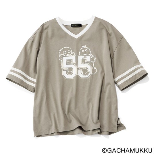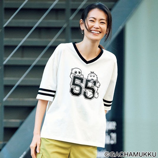dinos創業55周年記念「ガチャピン・ムック ナンバーTシャツ」 「ガチャピン・ムック ナンバーTシャツ」は、「55」ロゴとガチャピン・ムックをプリントしたアメフトTシャツです。「55」は今年で創業55周年を迎えるdinosと、永遠の5歳のガチャピン・ムックにちなんだ特別ナンバー。肩を落としたオーバーサイズに、浅めのVネック、肘まで届く袖には2本のラインを添え、ラフなデザインを大人に似合う表情に仕立てました。本商品を掲載したカタログ『DAMA collection +PLUS(ダーマ・コレクション+プリュス)』2026真夏号の5月26日(火)の発刊に先駆け、『ディノス オンラインショップ』で3月より先行販売いたします。