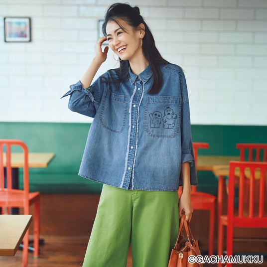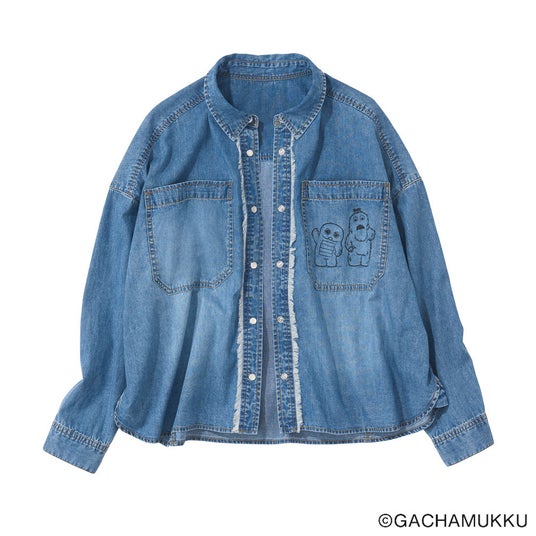 愛嬌たっぷりのふたりを描いた「ガチャピン・ムック デニムシャツ」