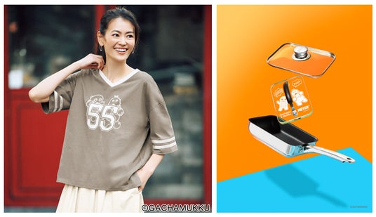 dinos創業55周年記念 「ガチャピン・ムック ナンバーTシャツ」(左)と「≪ガチャピン・ムックVer≫ MEYER/マイヤー 蓋付きエッグパン+プレス特別セット」(右)