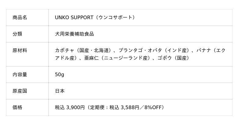 株式会社ZOOMIE(所在地:神奈川県茅ヶ崎市、代表:小林 佳奈)は、犬用栄養補助食品『UNKO SUPPORT』を2026年3月29日(土)より自社ECサイト(https://zoomiedogs.jp)にて税込3,900円で販売開始いたしました。原材料はカボチャ、バナナなど5つの食物素材のみ。保存料・着色料・香料全て不使用、ペット栄養学を専門とする獣医師の監修のもとで開発した、「REAL FOOD SUPPLEMENT(食べ物だけで作った犬用栄養補助食品)」です。ペットサプリメント市場が拡大を続ける中(※)、欧米で広がる「REAL FOOD」の流れを日本の犬用サプリメントに持ち込みました。