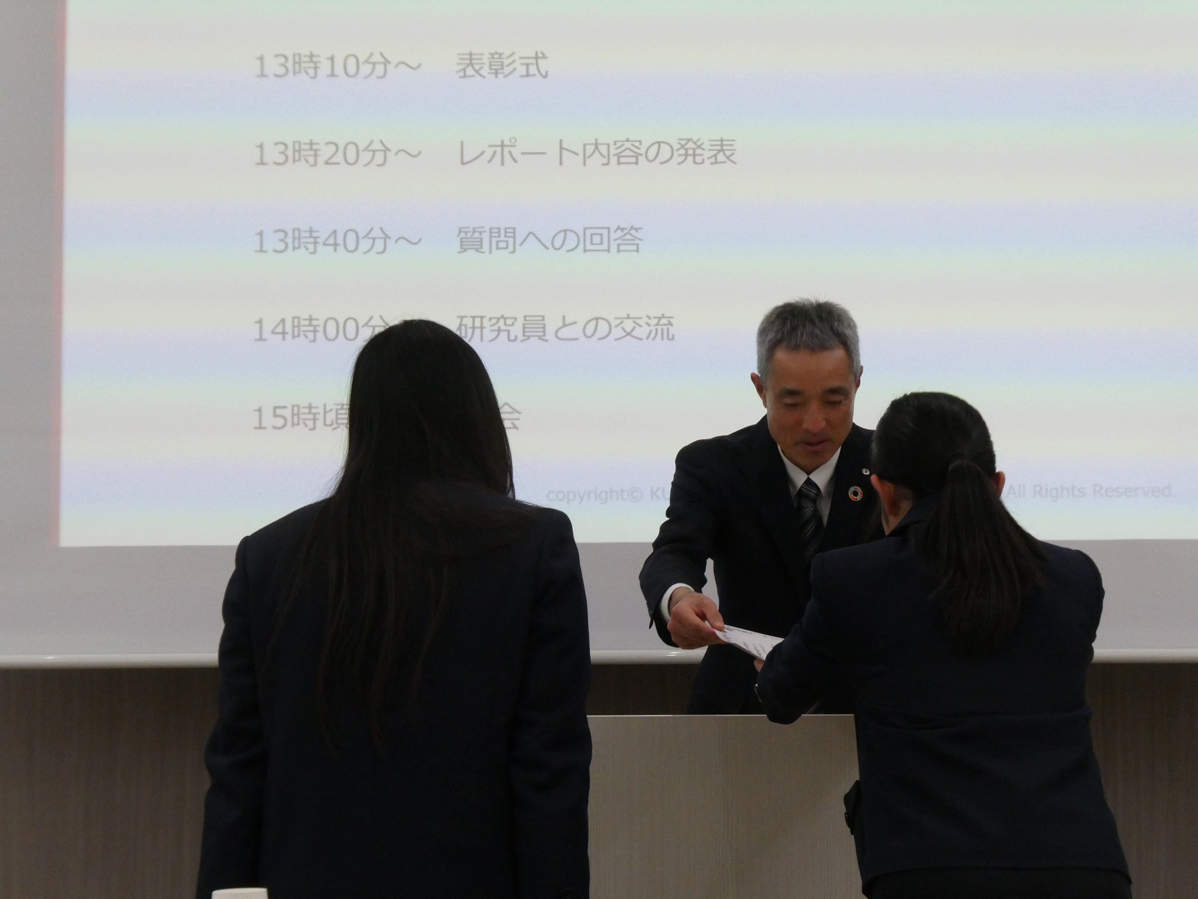 クミアイ化学は、世界の食料・農業を支える企業として未来を担う高校生の皆さんと一緒になって、食や農業に関する問題を考えるため、2025年5月から10月にかけて「第2回 高校生のための食育プログラム 食料生産に関するグループディスカッション」を実施いたしました。全249グループ967名が本企画に参加し、提出されたレポートを当社で審査した結果、京都教育大学付属高等学校のグループのレポートが優秀賞として選出されました。2026年2月16日には、優秀レポートを作成した高校生を当社の化学研究所(Shimizu Innovation Park/ShIP)にお招きして表彰式を開催し、会社紹介、所内の見学、高校生によるレポートに関するプレゼンテーション、質疑応答や当社役員・研究員との交流を行いました。質疑では多くの質問が寄せられ、研究や農薬についての理解をより深めていただく機会となりました。