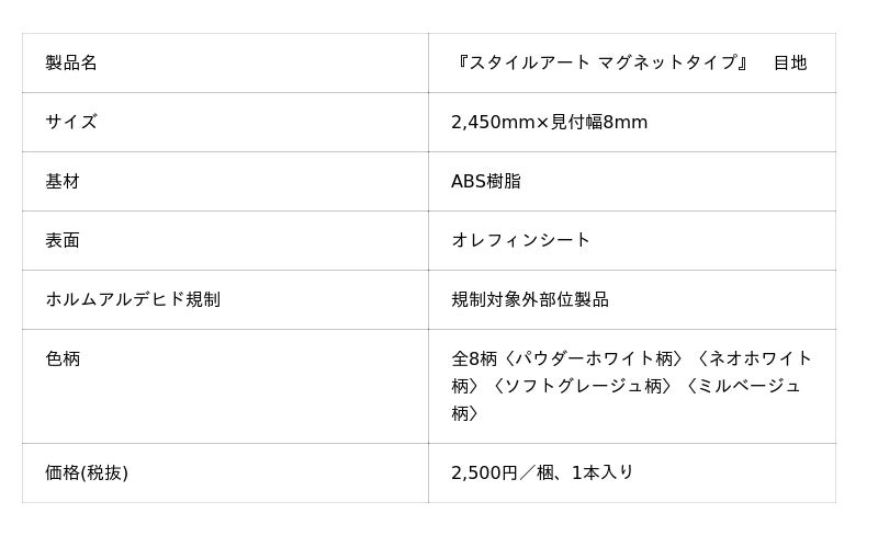 そして今回、住宅向けのマグネットが使用可能な壁材の新製品として、多様な空間になじみやすい8柄をラインアップした『スタイルアート マグネットタイプ』を発売します。ホワイト系からダーク系、流行のグレージュ系などを揃えたことで、居室空間の意匠性を損なうことなくマグネットをご使用いただけるほか、当社の収納・建具製品と共通したカラー展開にしているため、収納・建具と壁面のコーディネートによって、統一感のある空間づくりも可能です。