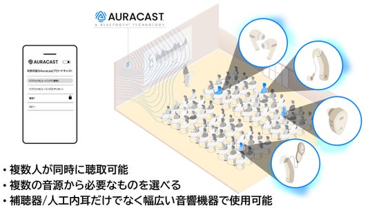 会場では「ジール」の試聴体験機会を提供し、参加メディアは次世代ワイヤレス通信「Auracast(TM)(オーラキャスト)」を通じて同時通訳音声を聴取しました。操作はスムーズに行われ、実際に装用した記者からは「自然な装用感で違和感がない」「非常に興味深い体験だった」など、ポジティブな評価が寄せられました。