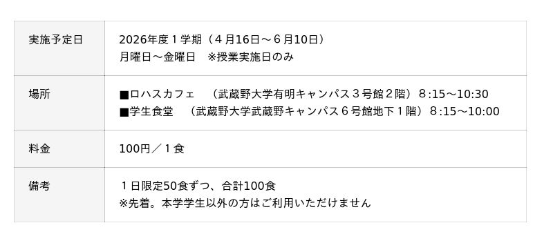 取り組んでおり、その取り組みの一環として、4月よりキャンパス内の「ロハスカフェ(有明)」および学生食堂(武蔵野)において、本学学生を対象とした「100円朝食プロジェクト」を開始します。本プロジェクトは物価高騰が続くなか、学生に対する経済的支援に加え、学生に朝食を取る習慣をつけてもらうことも目的として実施します。