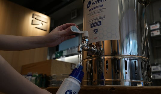 容器はご持参制となっており、お気に入りのボトルや容器をお持ちいただくことで、「洗剤を汲む」という少し不思議な体験をお楽しみいただけます。なお、容器のサイズに関わらず、注ぐ量はオールウォッシュボトル1本分(420ml)までとさせていただきます。