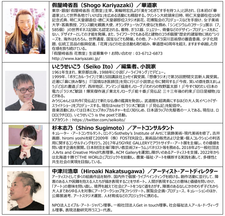 華道家の假屋崎省吾さん、編集者・小説家のいとうせいこうさん、アートコンサルタントの杉本志乃さん、アーティストの中津川浩章さんに審査をご担当いただきます。